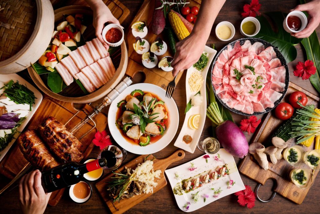 沖縄の海と大地の恵みを堪能。しゃぶしゃぶ出汁や野菜・フルーツの旨みをたっぷり使ったソースをお好みで合わせて
